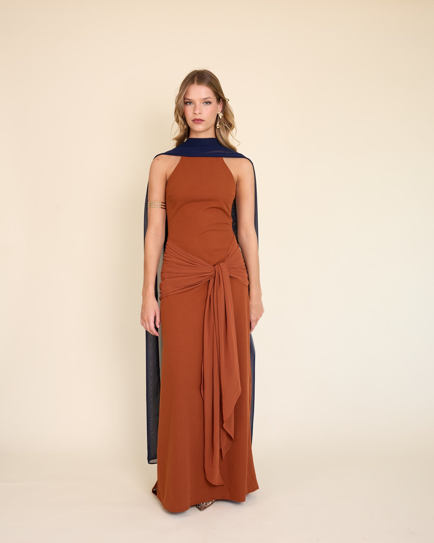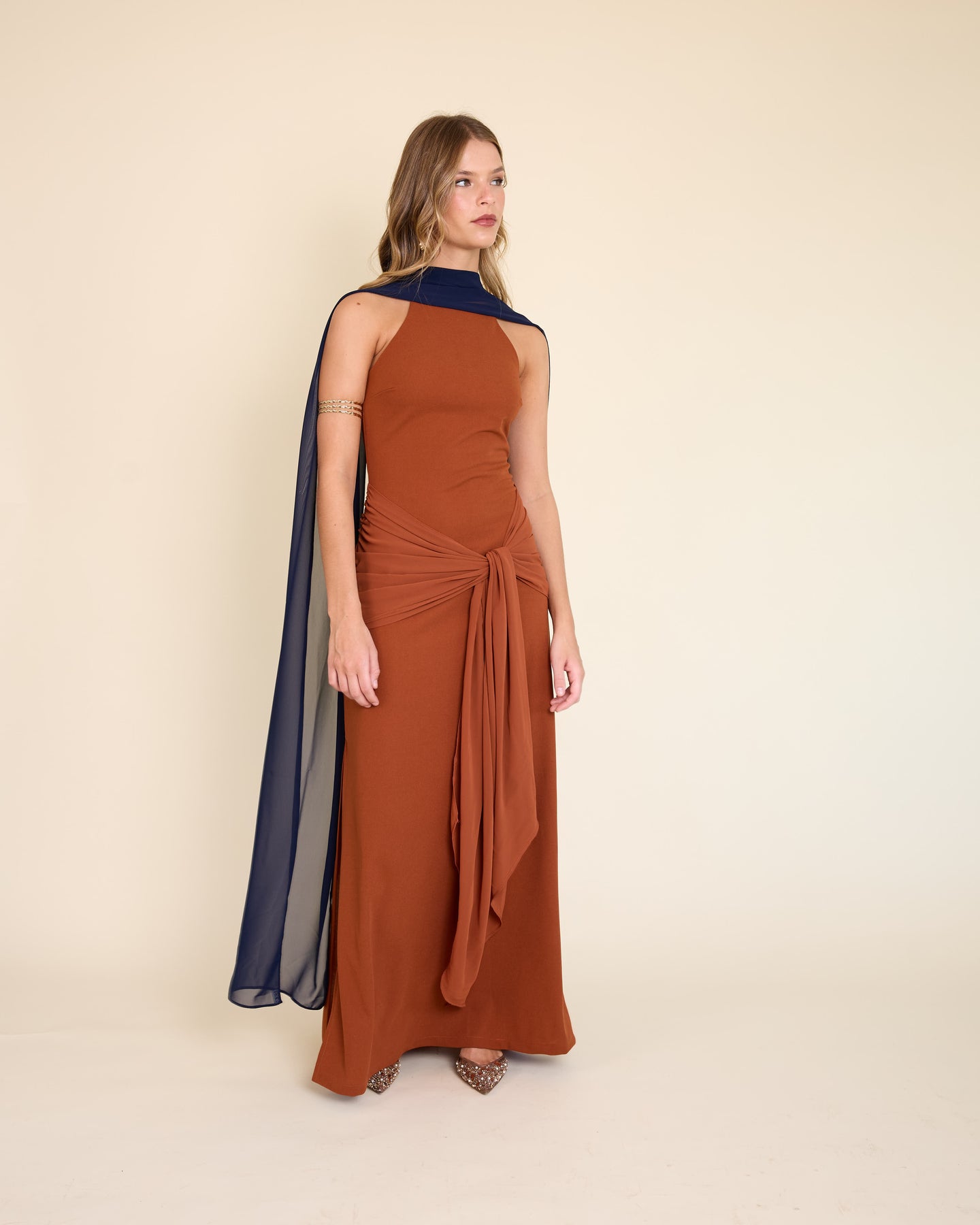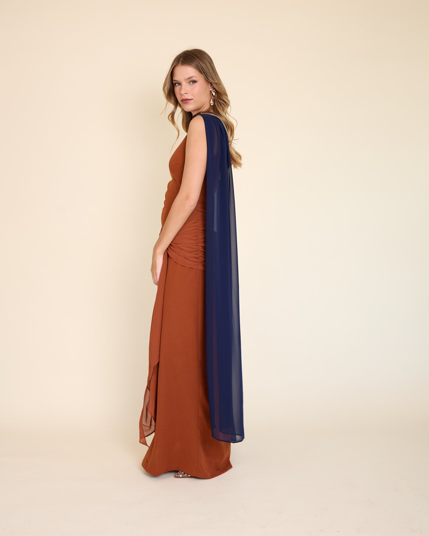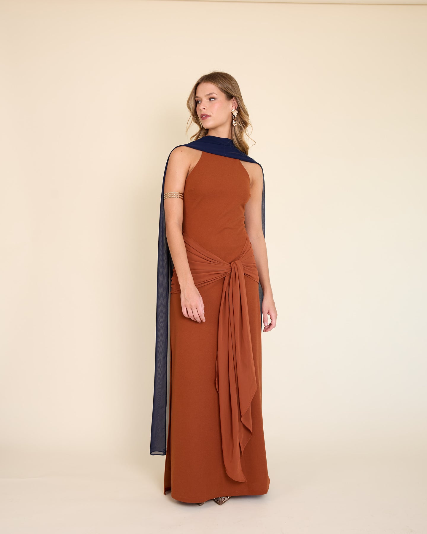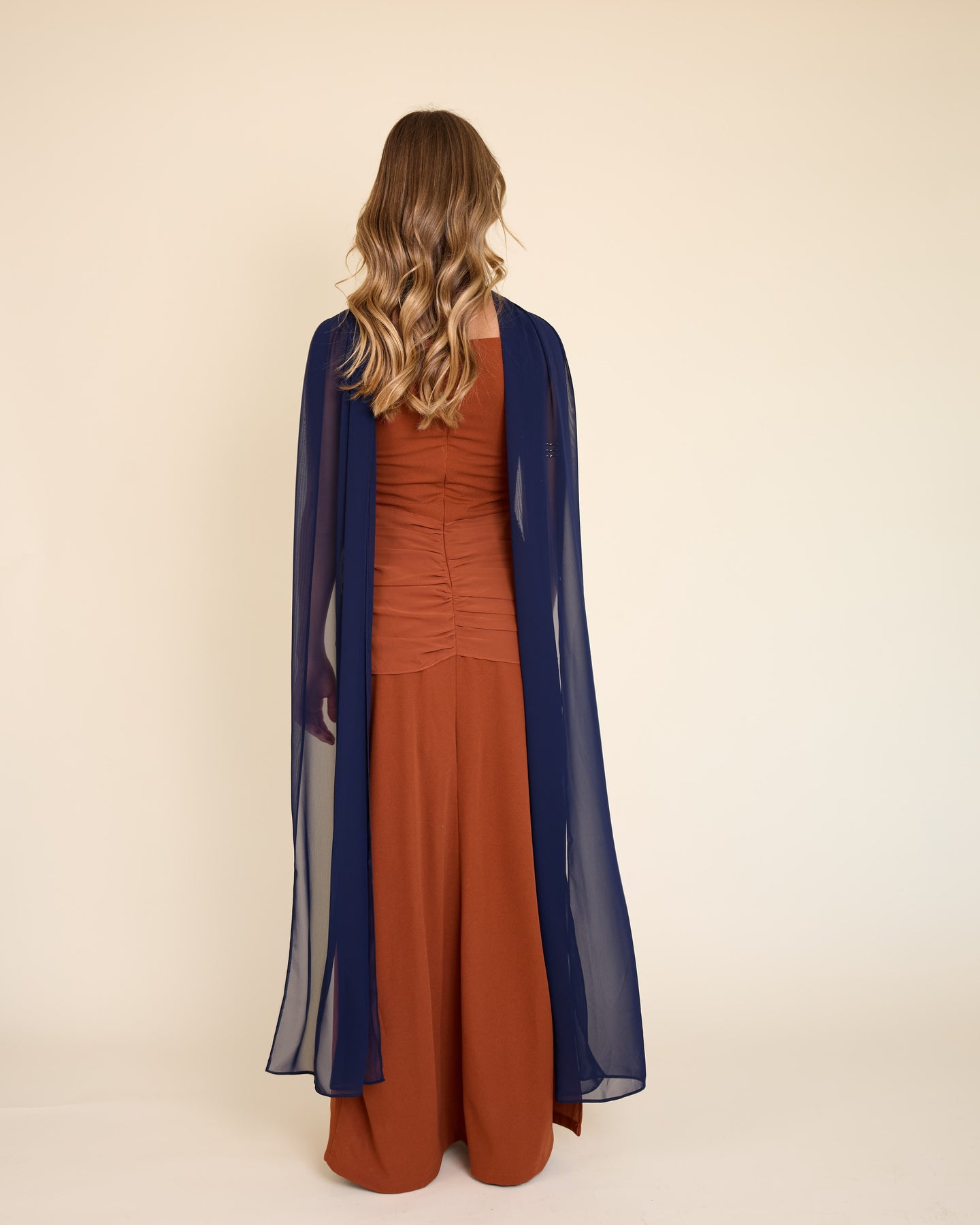 Es un accesorio muy especial y versátil. Es un rectángulo largo de gasa liviana, tamaño XL, que llega hasta el piso y se mueve precioso al caminar.