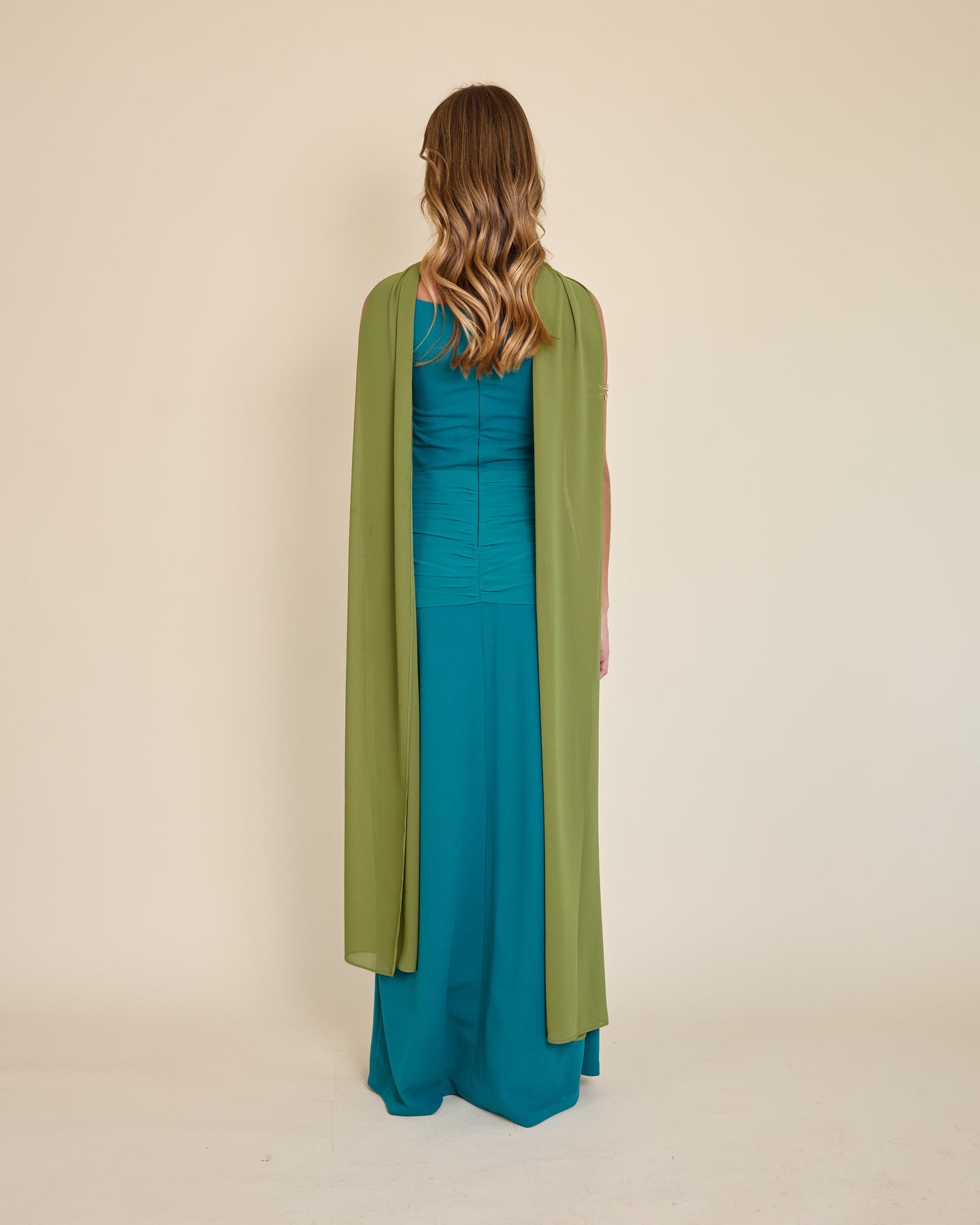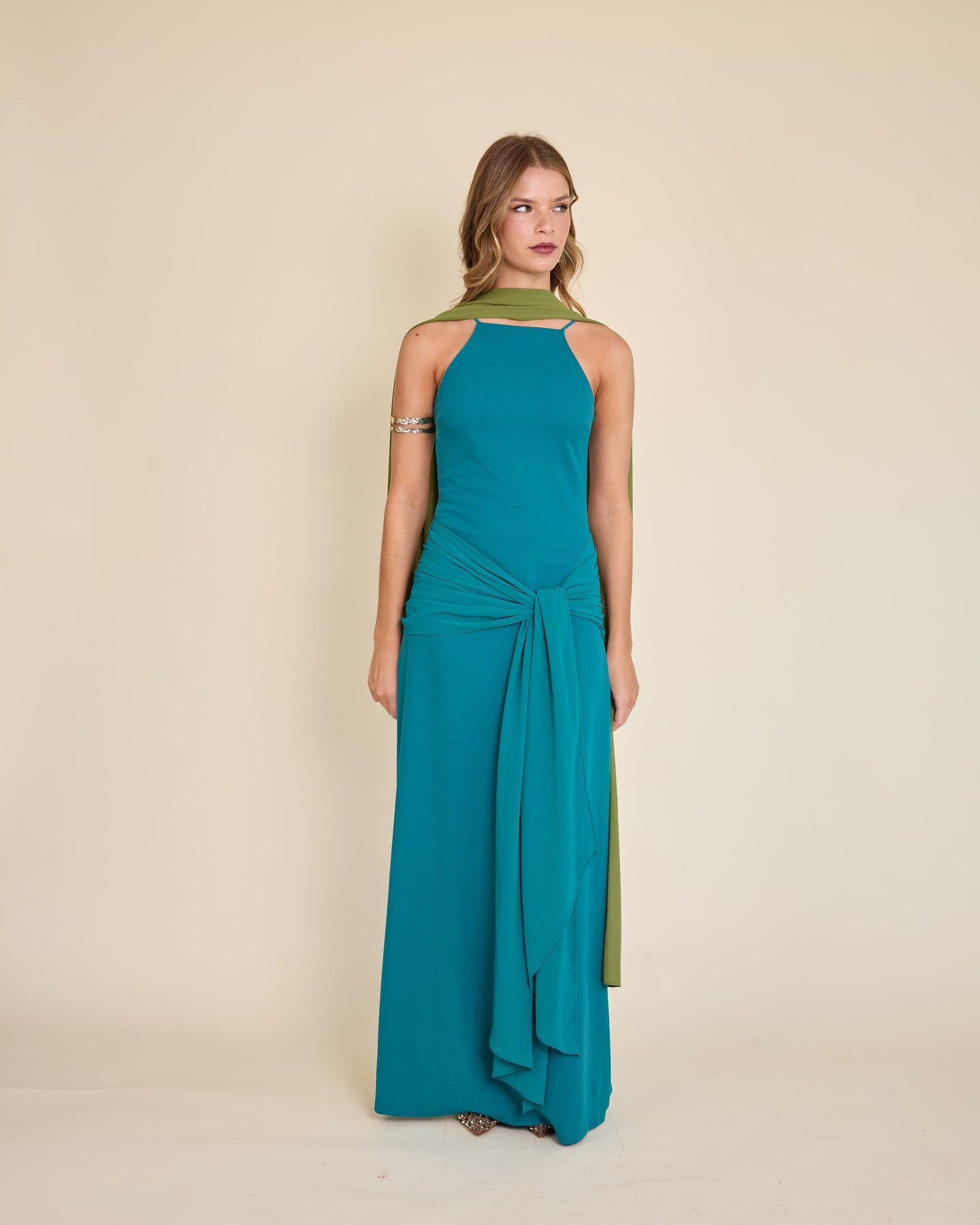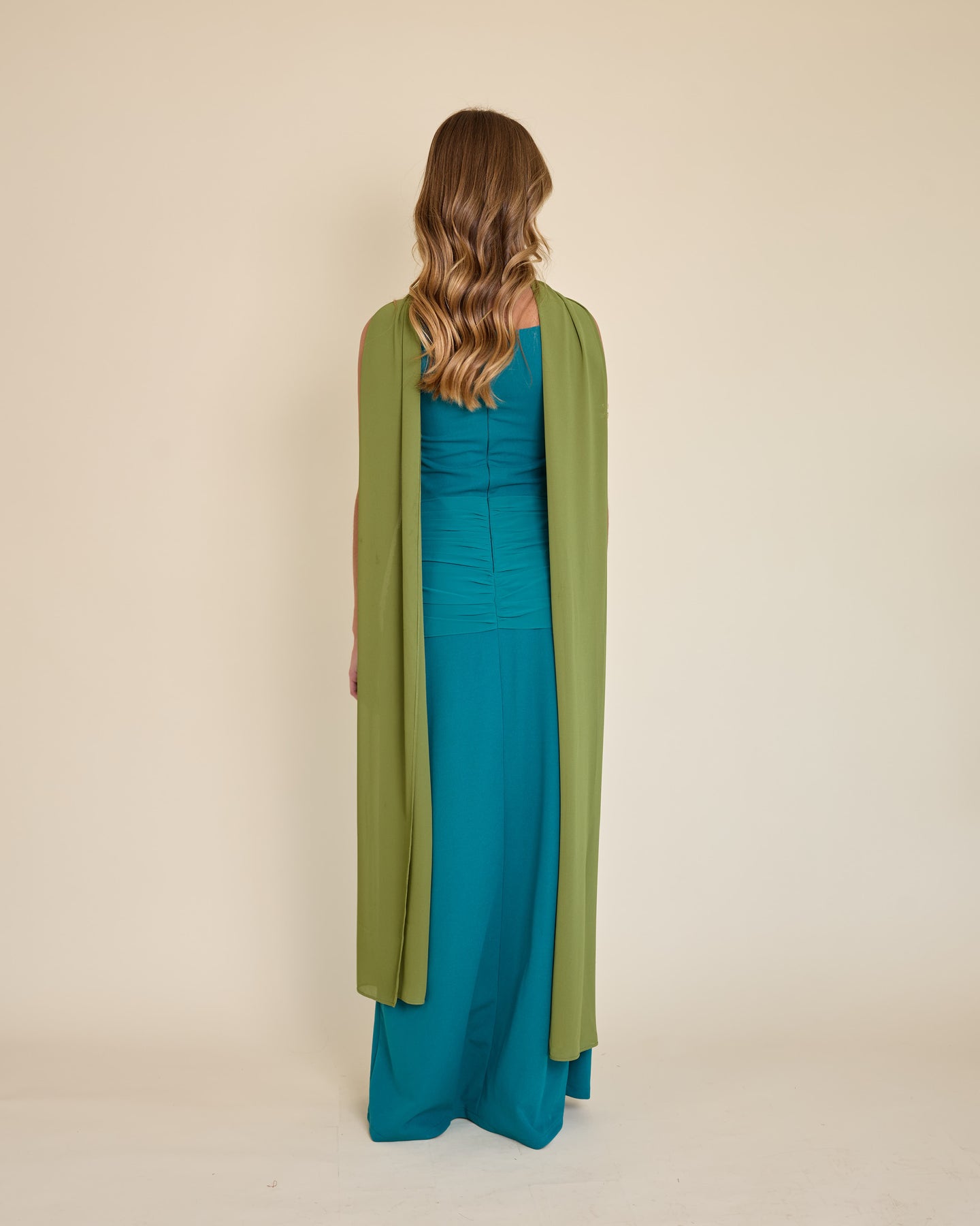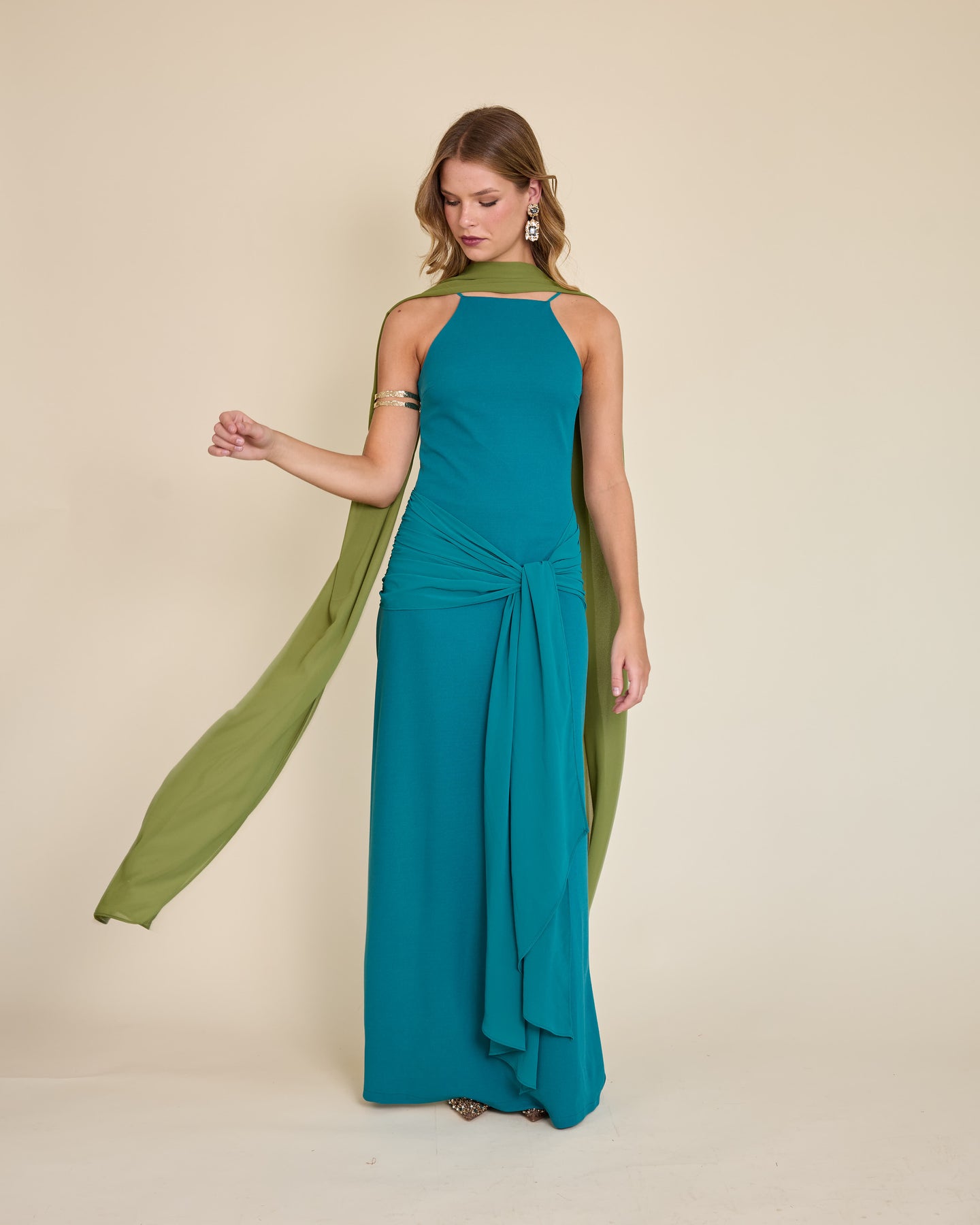 Es un accesorio muy especial y versátil. Es un rectángulo largo de gasa liviana, tamaño XL, que llega hasta el piso y se mueve precioso al caminar.