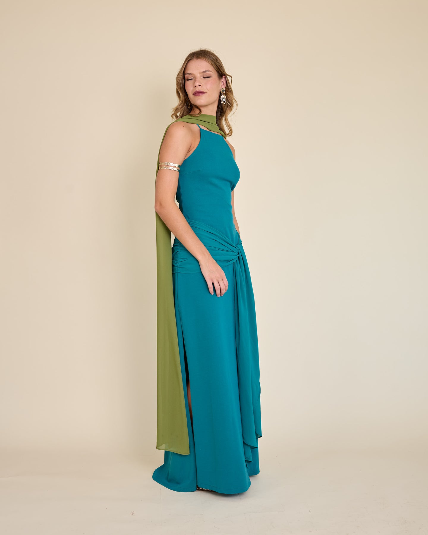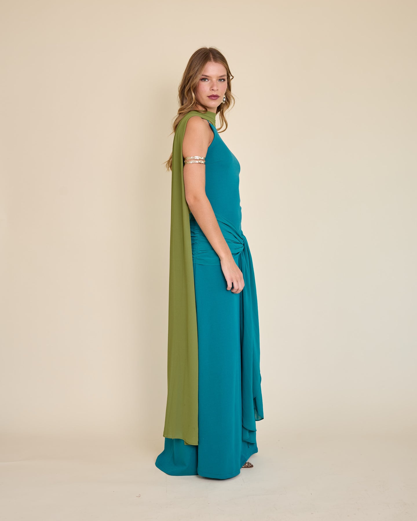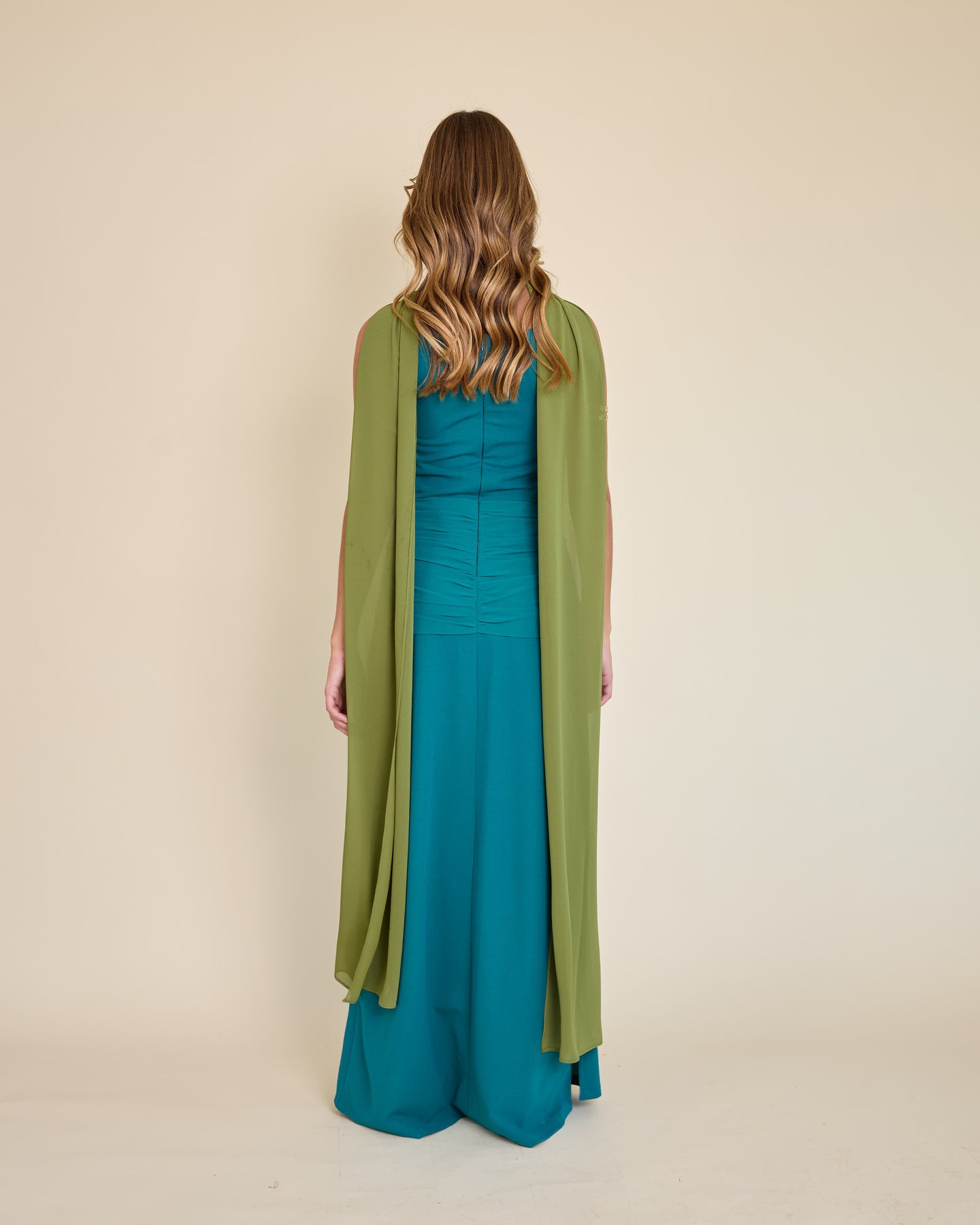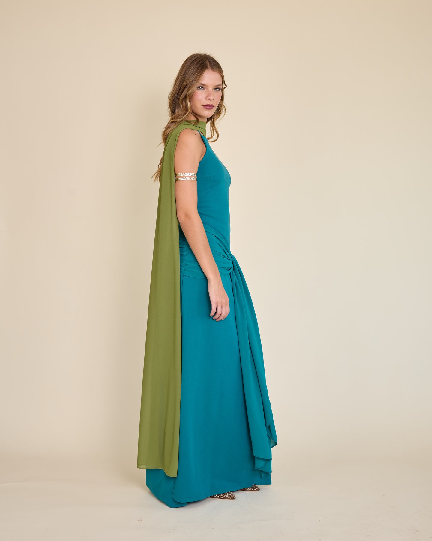 Es un accesorio muy especial y versátil. Es un rectángulo largo de gasa liviana, tamaño XL, que llega hasta el piso y se mueve precioso al caminar.