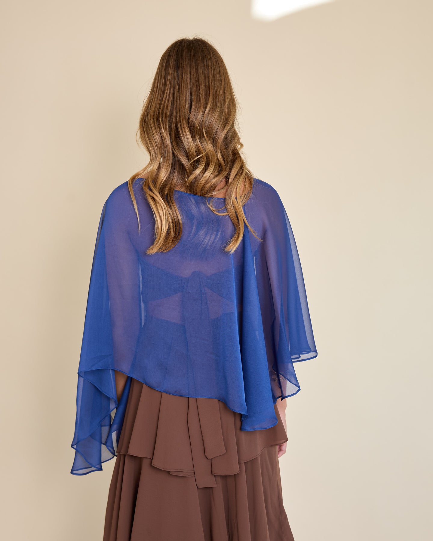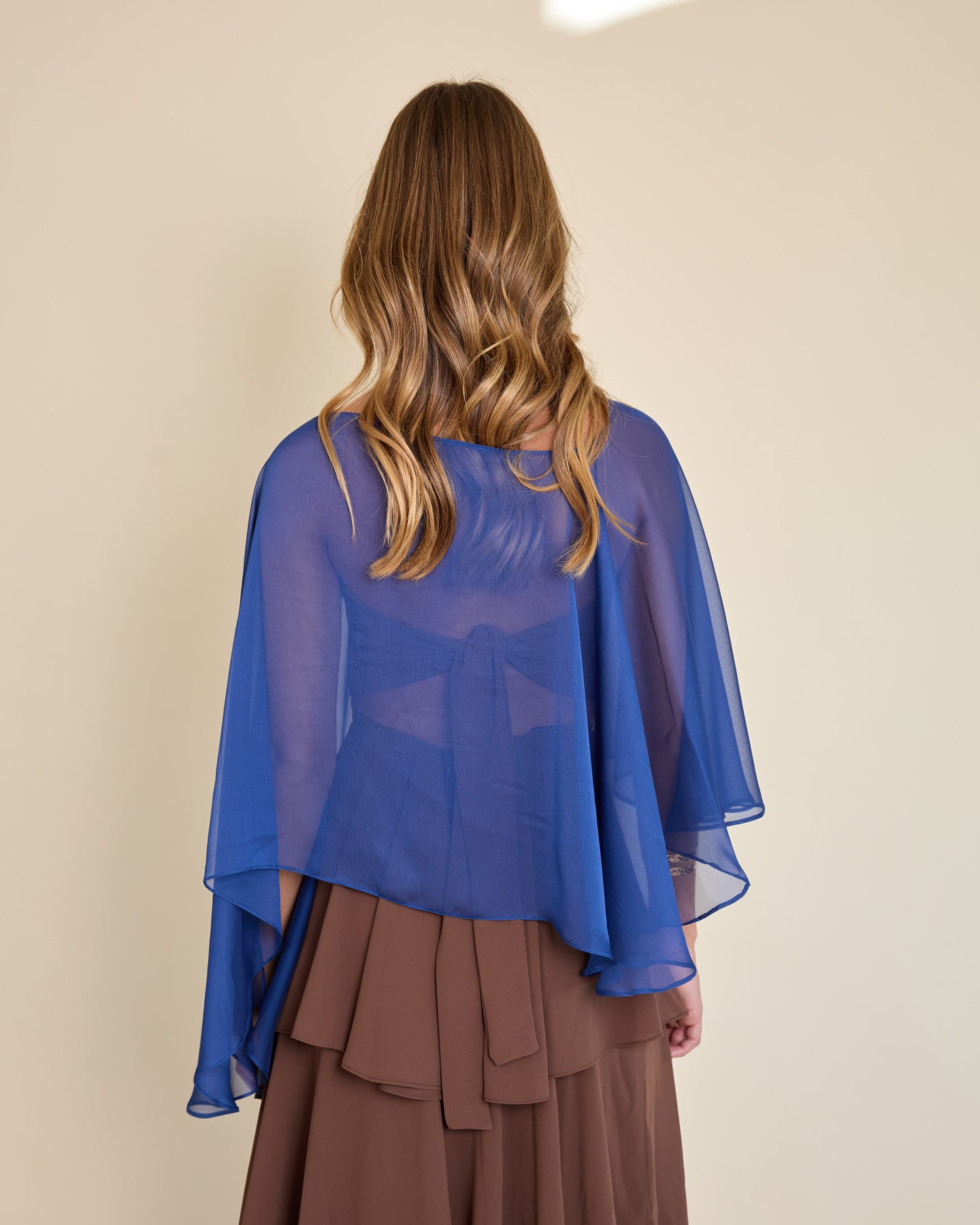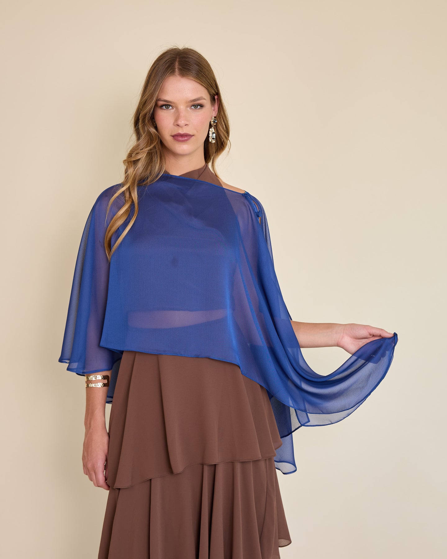 Esta capa de gasa ligera tiene una caída asimétrica que aporta un movimiento etéreo y muy elegante al look ✨