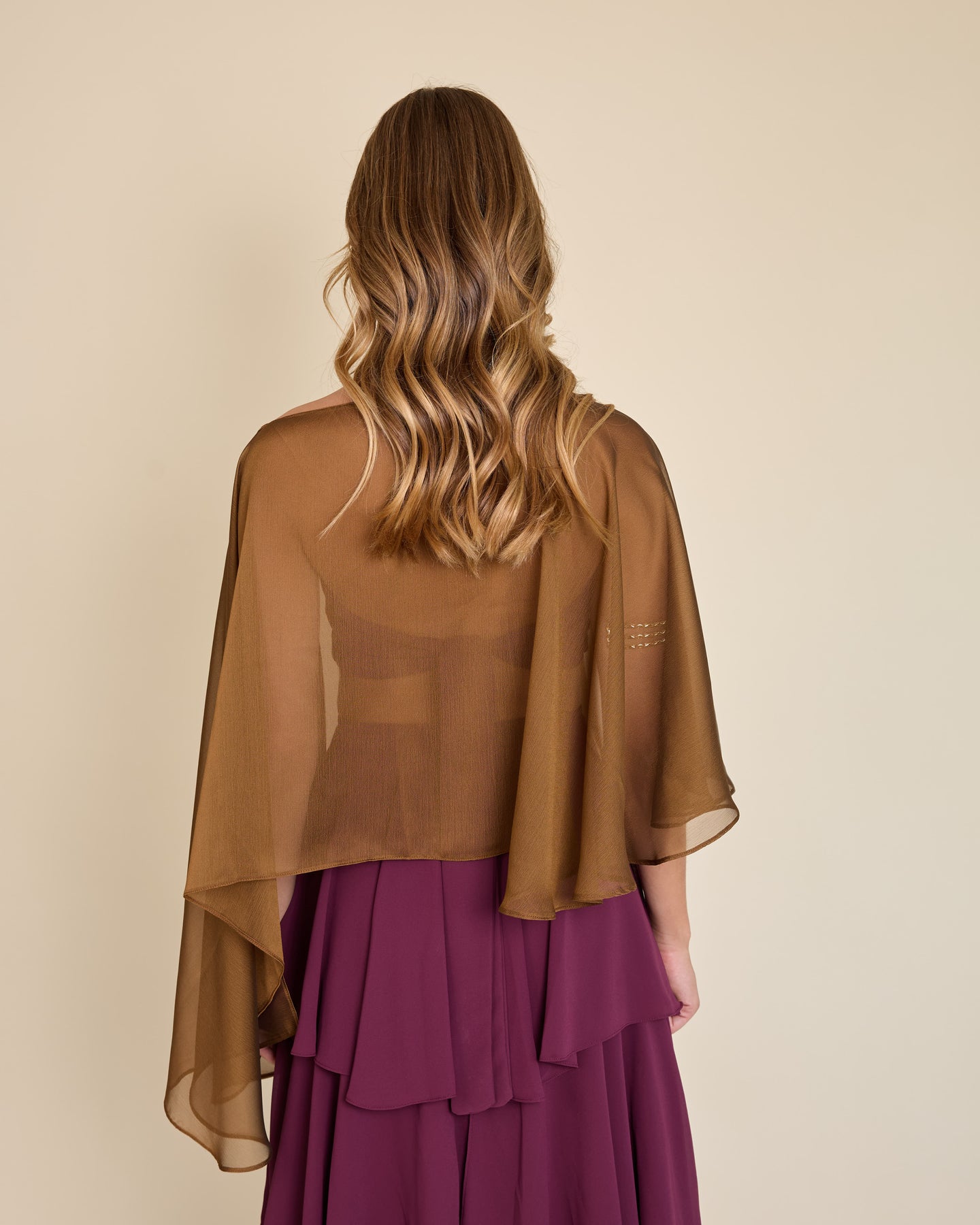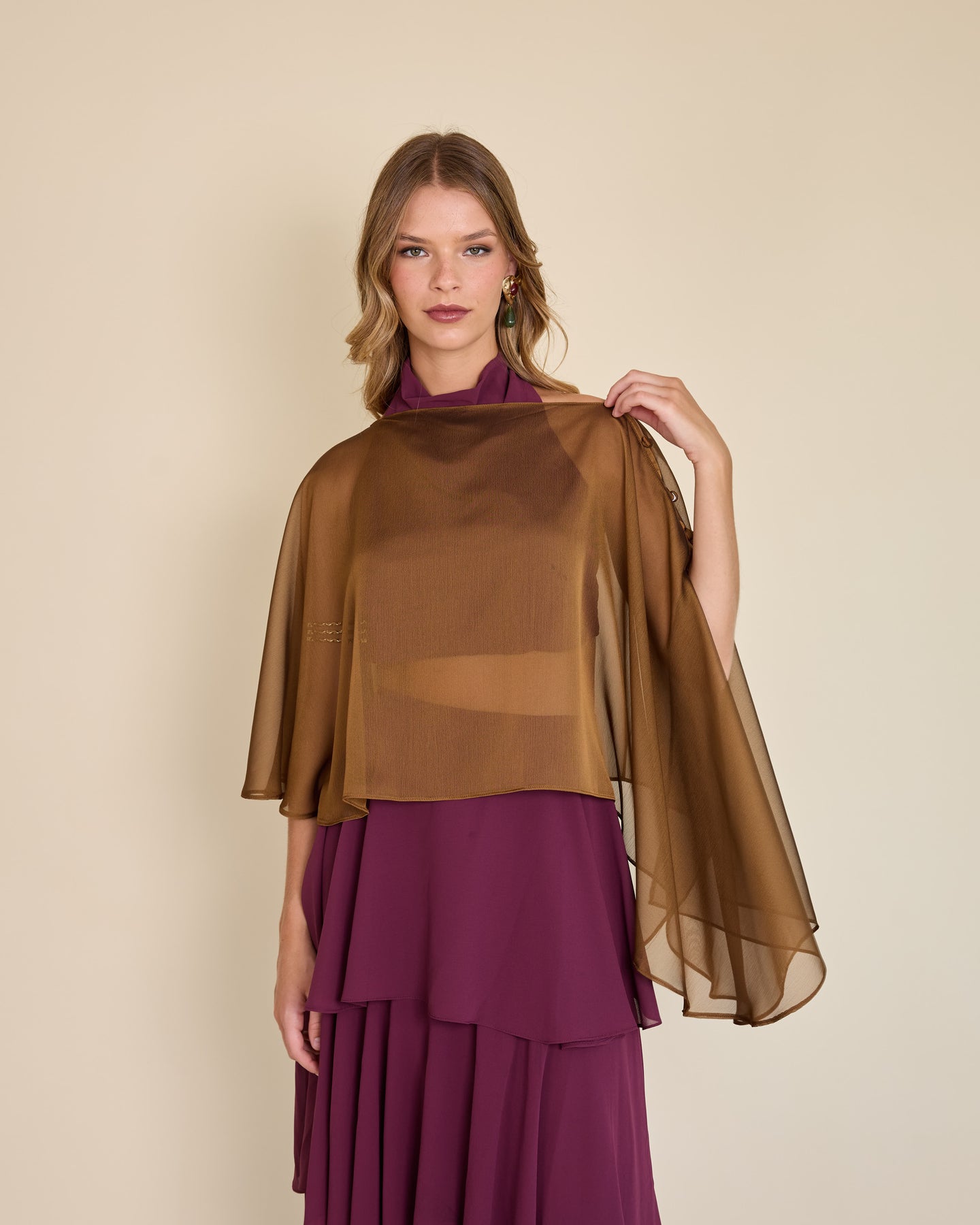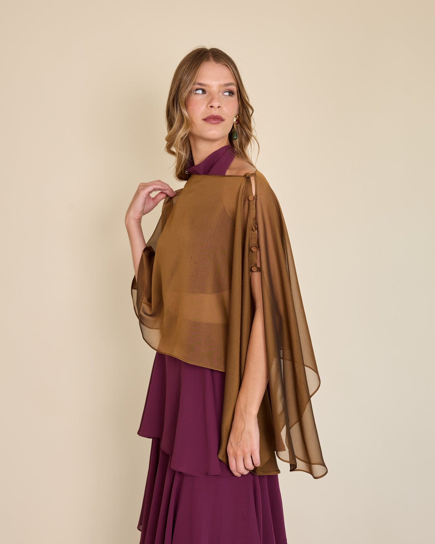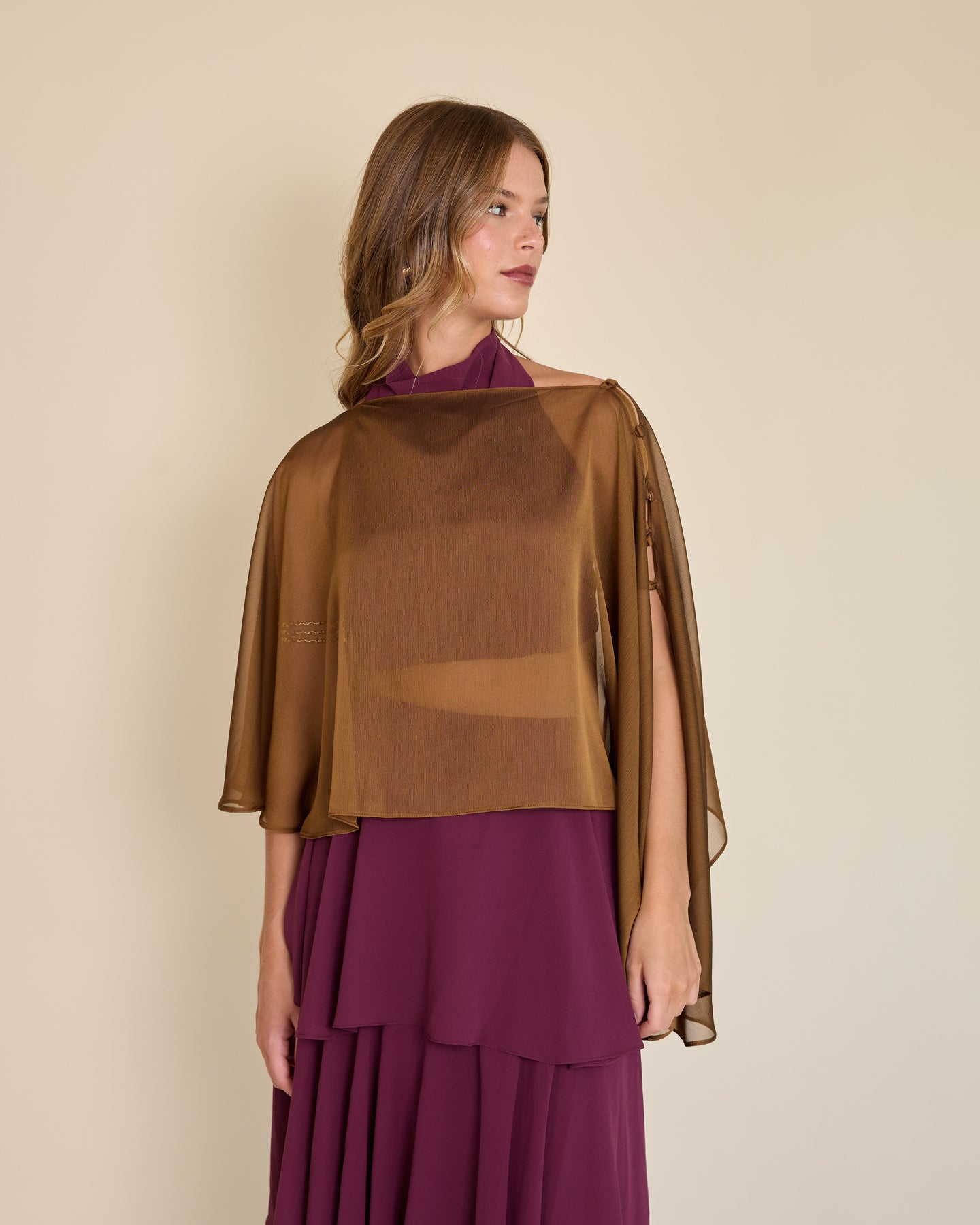 Esta capa de gasa ligera tiene una caída asimétrica que aporta un movimiento etéreo y muy elegante al look ✨