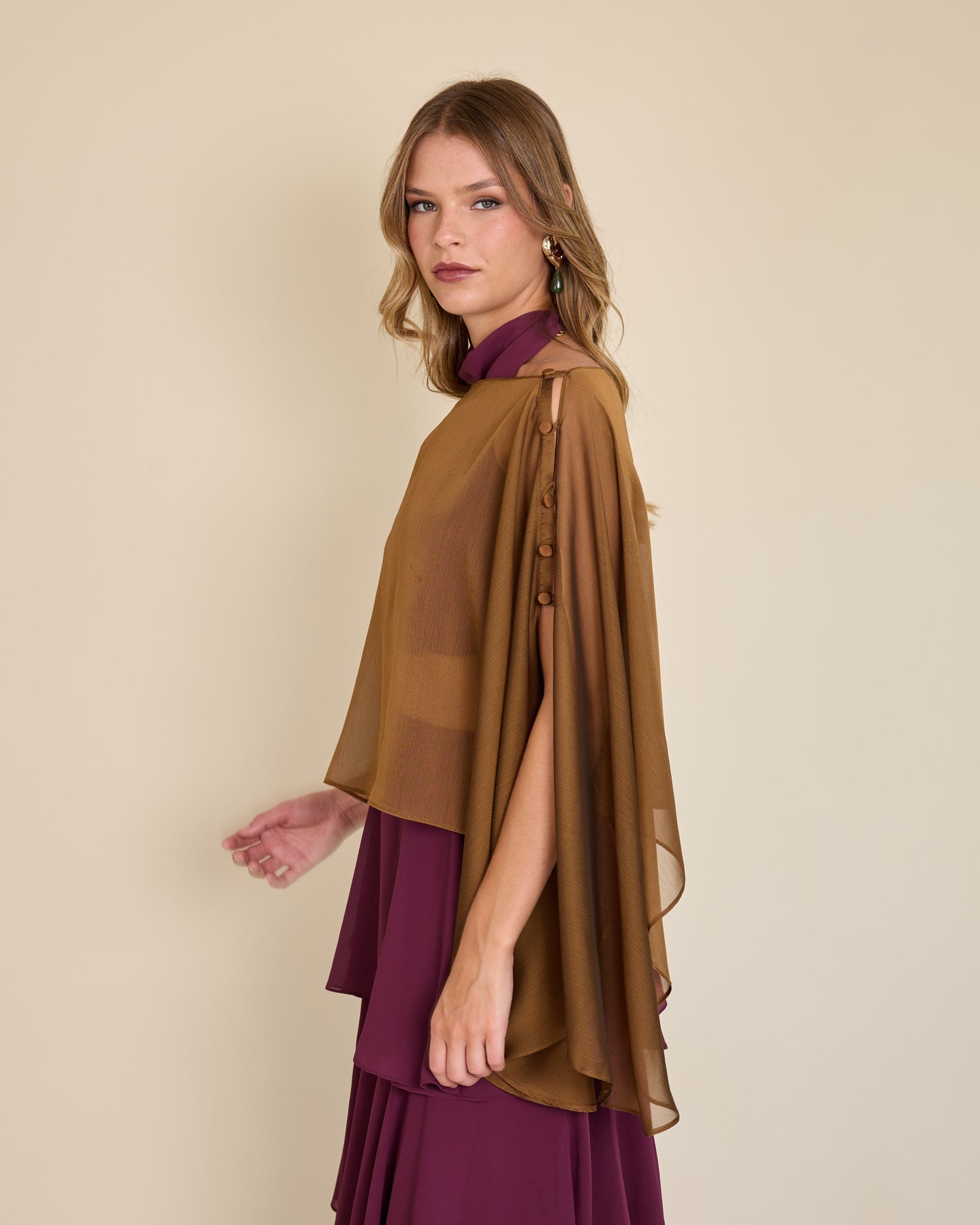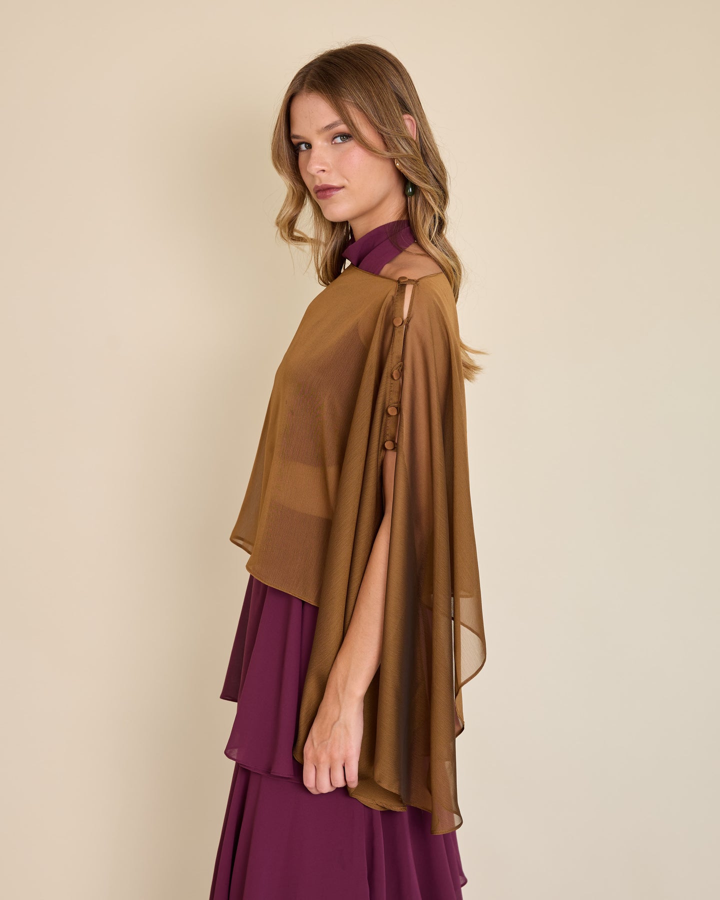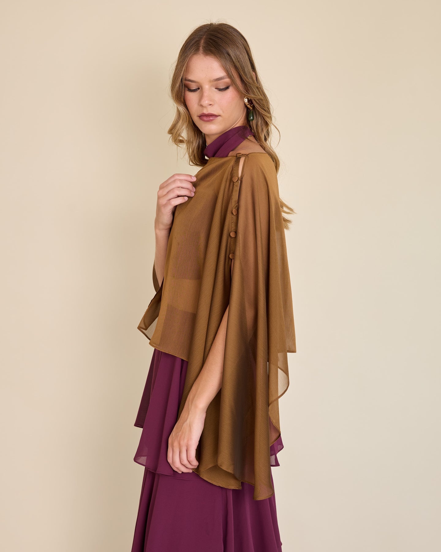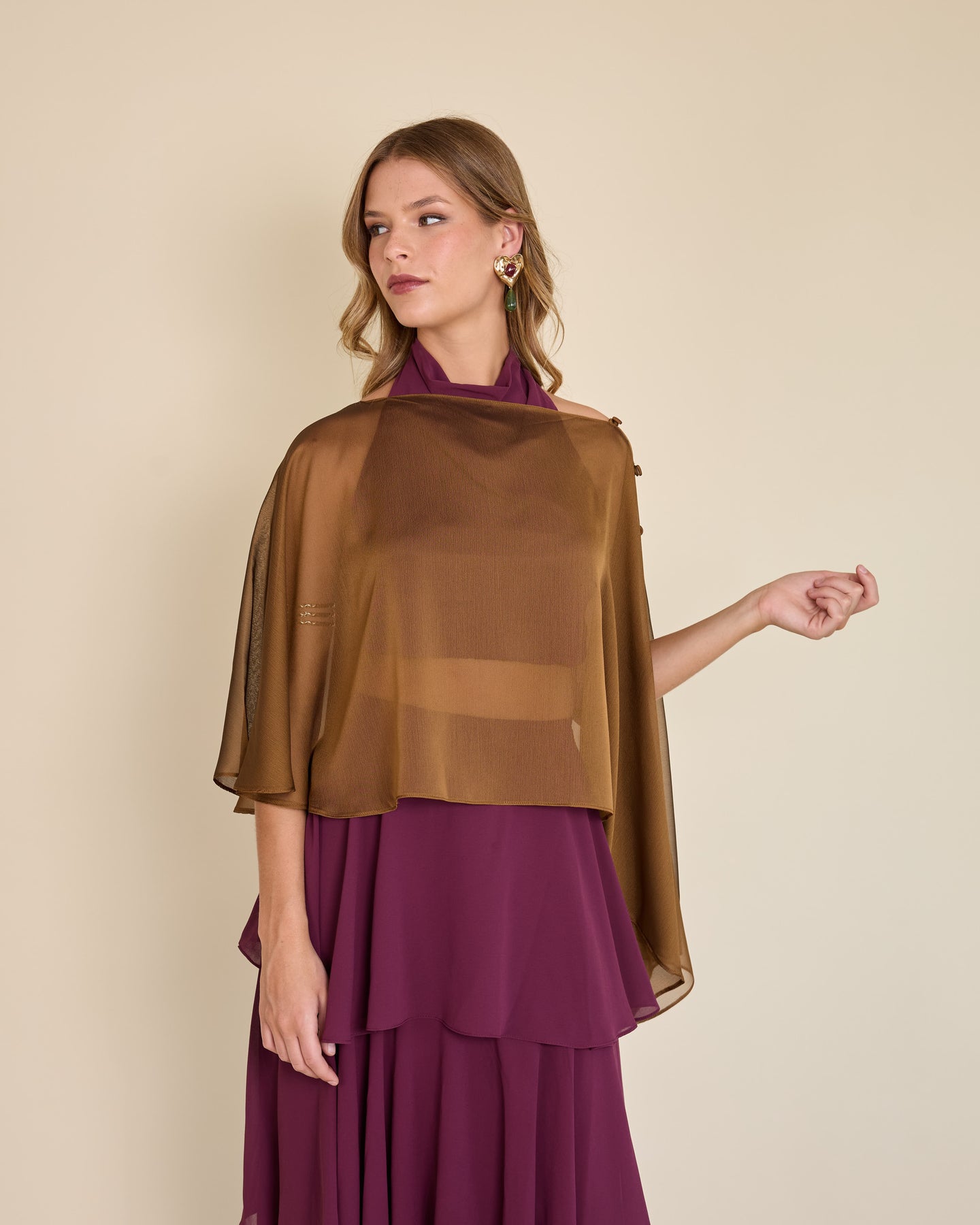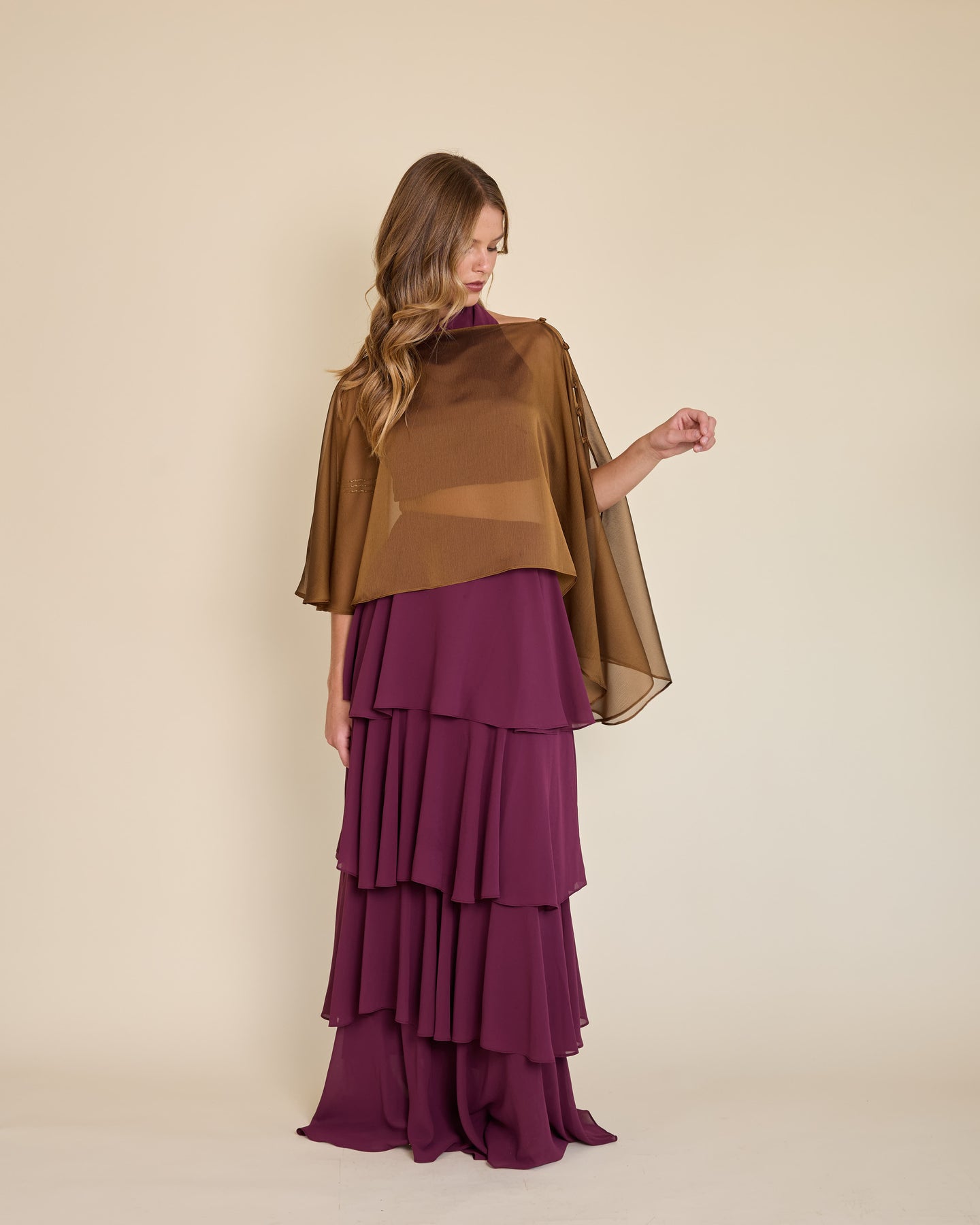 Esta capa de gasa ligera tiene una caída asimétrica que aporta un movimiento etéreo y muy elegante al look ✨