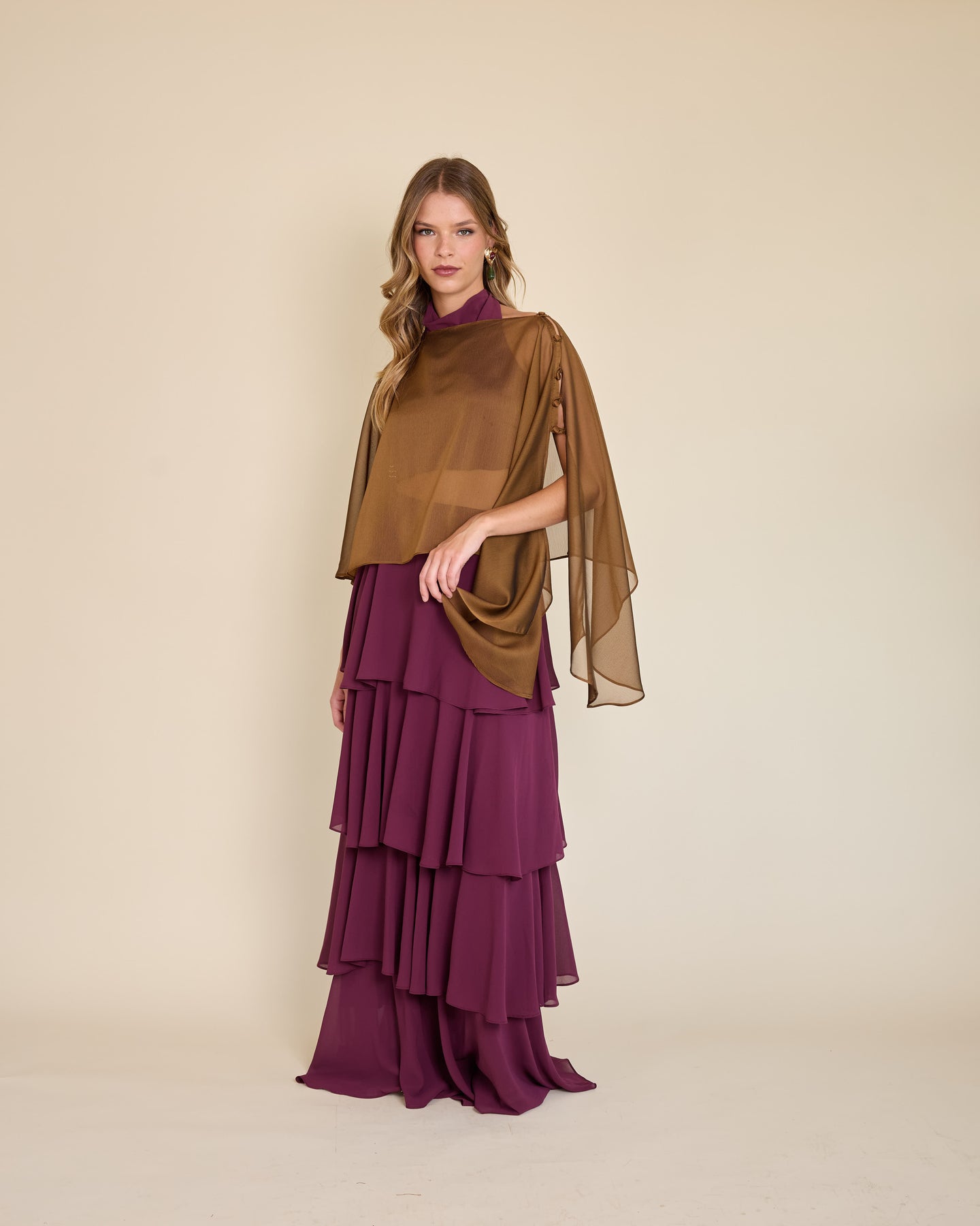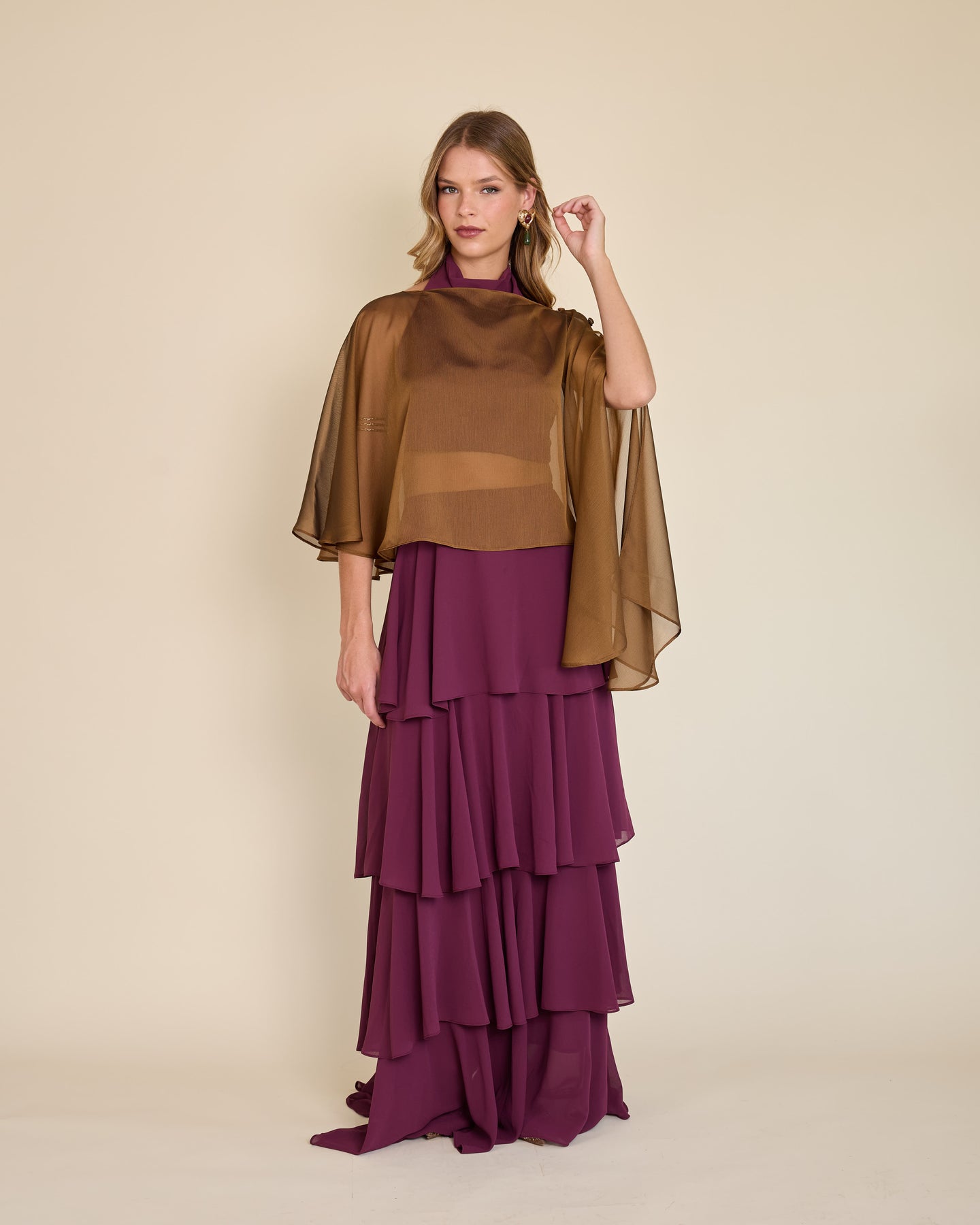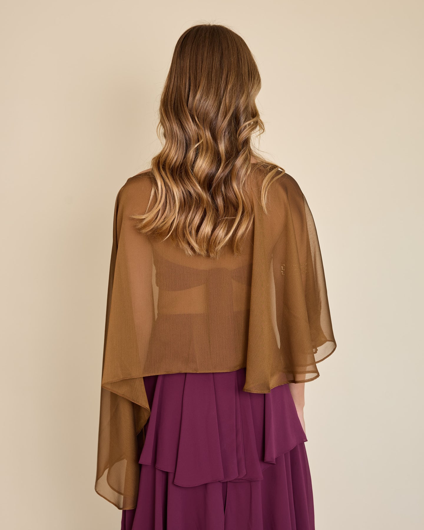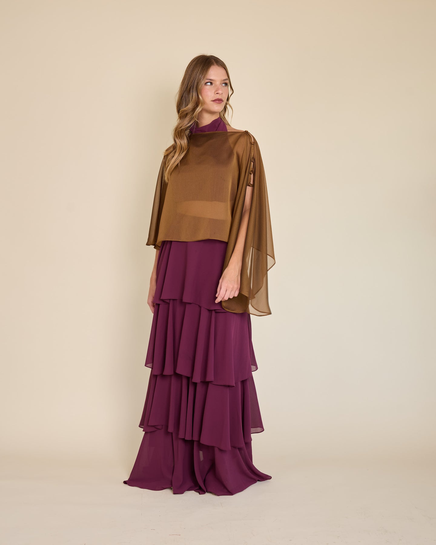 Esta capa de gasa ligera tiene una caída asimétrica que aporta un movimiento etéreo y muy elegante al look ✨