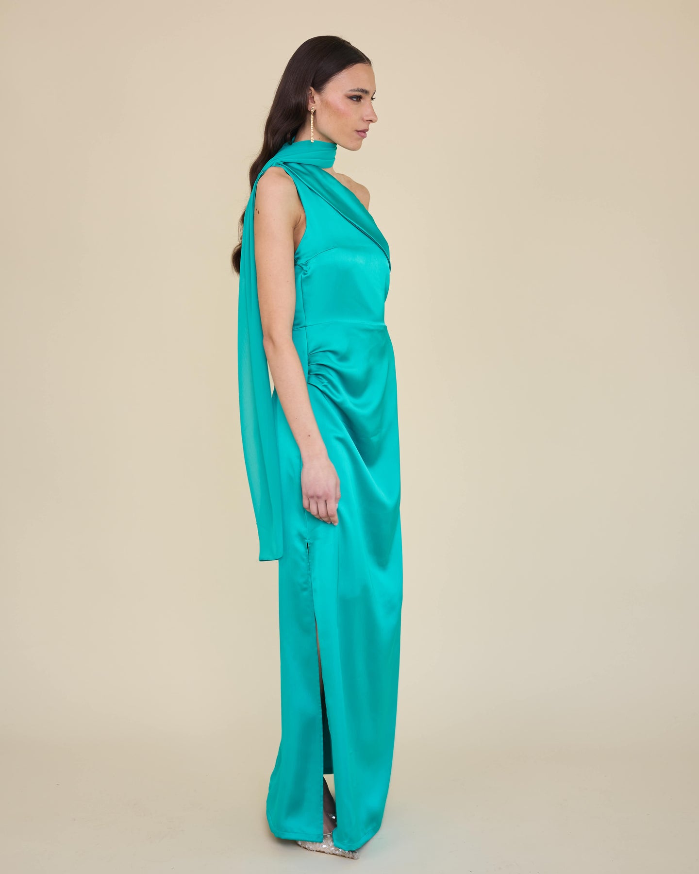 Escote asimétrico, drapeados en la guata y abertura lateral que equilibra elegancia con sensualidad💃🏽