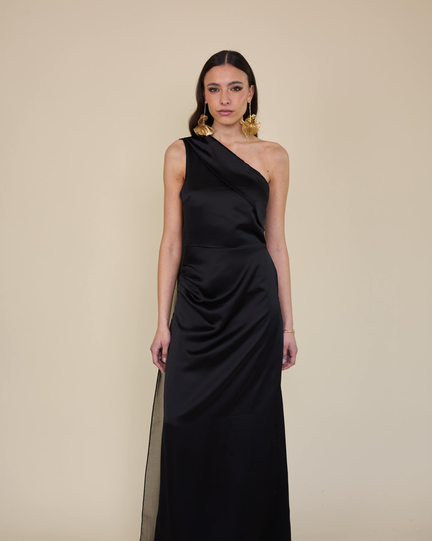 Escote asimétrico, drapeados en la guata y abertura lateral que equilibra elegancia con sensualidad💃🏽