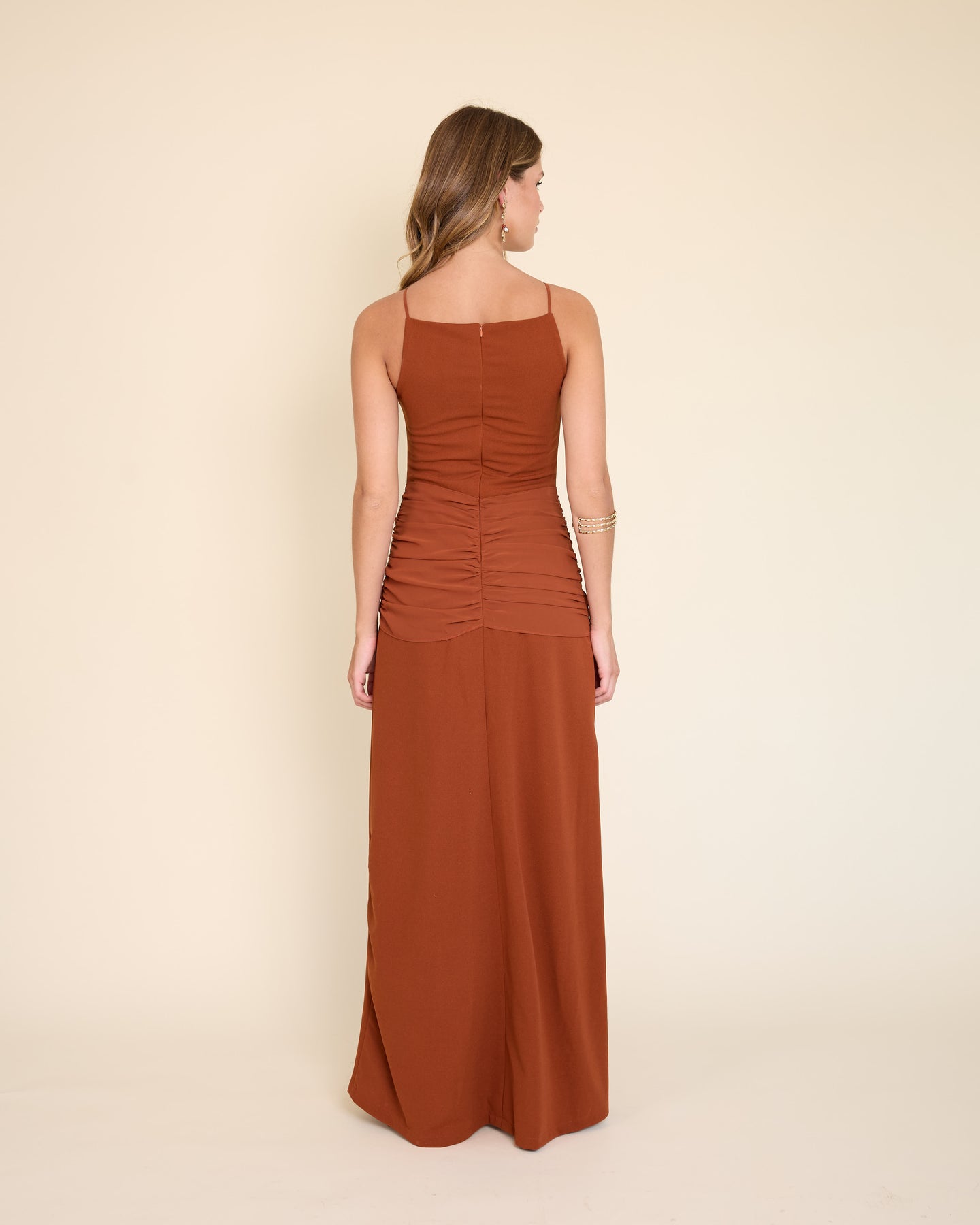 El Vestido Federica tiene un diseño halter de escote cuadrado que resalta los hombros de forma muy elegante 🧡