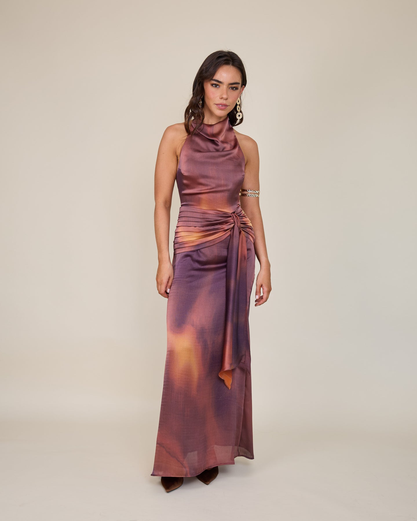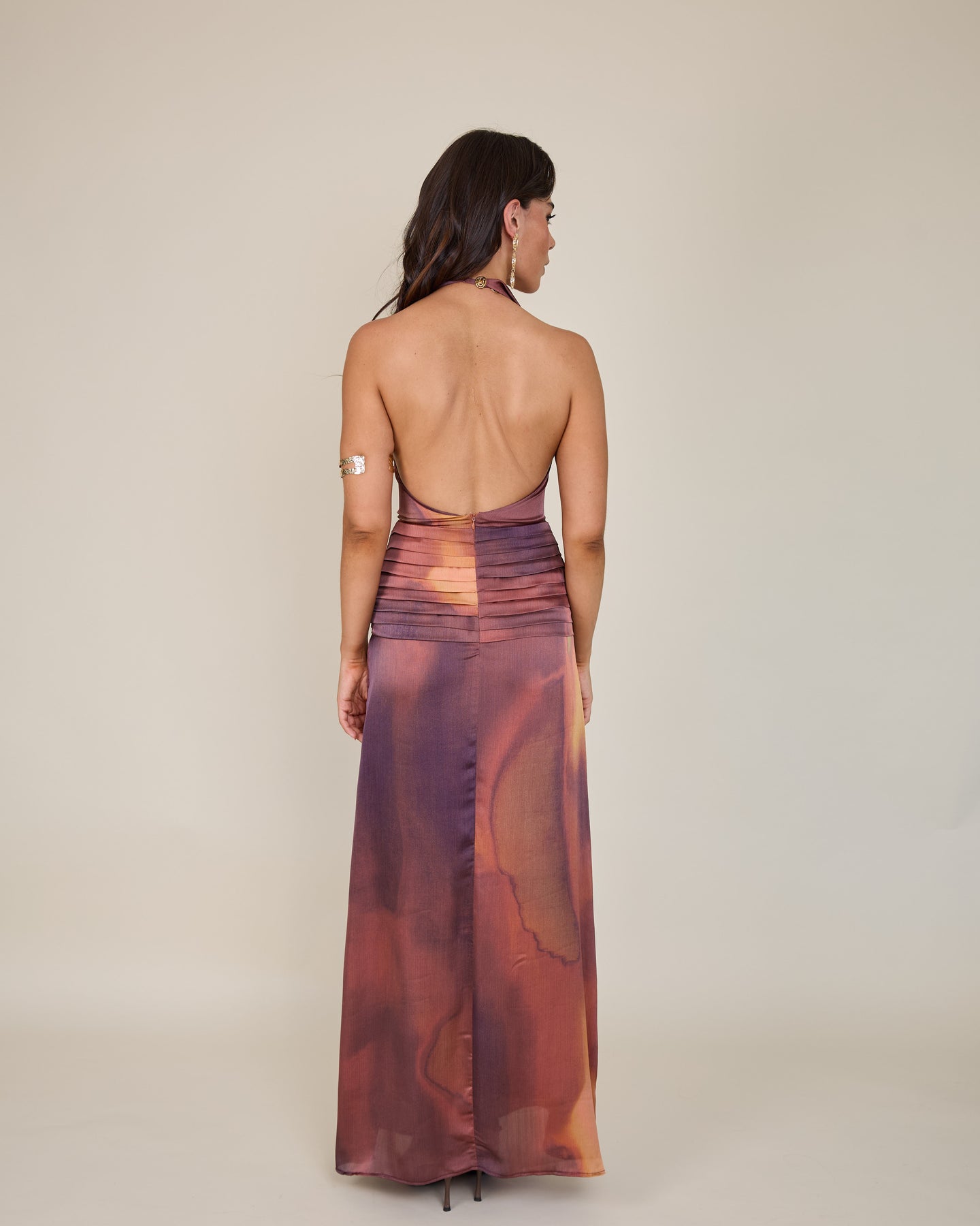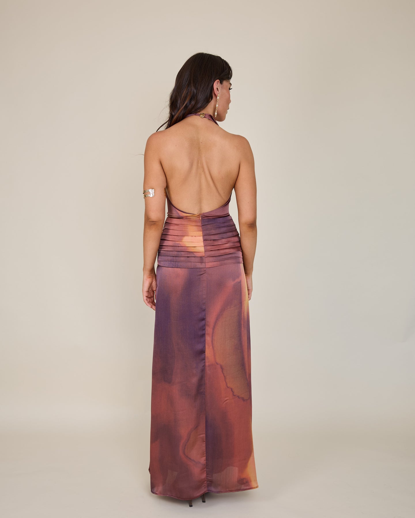 Su cuello drapeado estilo halter aporta una sofisticación contemporánea, creando una silueta alargada y muy femenina. El detalle de lazo en la cintura dibuja y define la figura con precisión. El verdadero factor sorpresa es su espectacular espalda abierta, que se cierra mediante un botón en la nuca, equilibrando el allure y la elegancia. Te lo pones… y te sientes lista para deslumbrar con un aire de naturalidad absoluta🌙😮💨