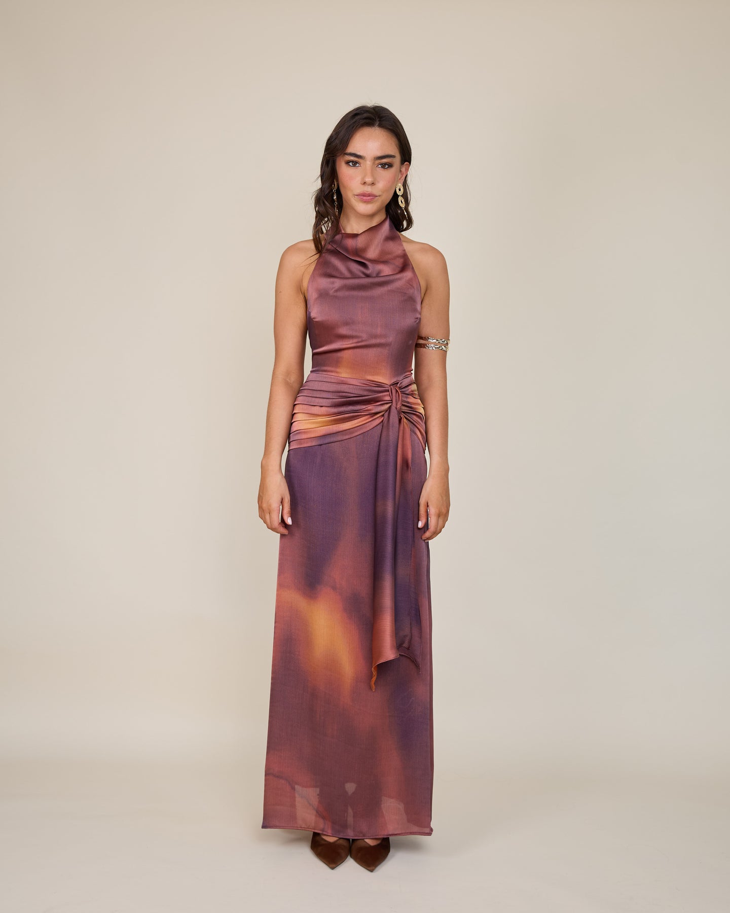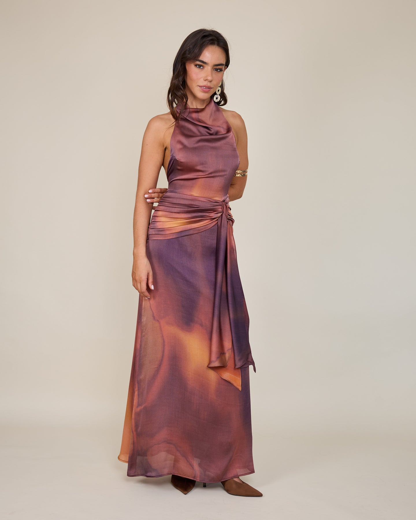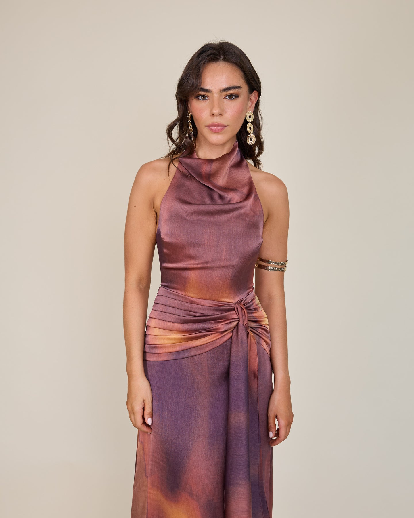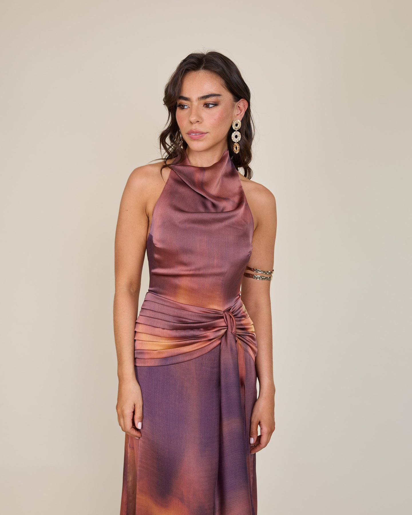 Su cuello drapeado estilo halter aporta una sofisticación contemporánea, creando una silueta alargada y muy femenina. El detalle de lazo en la cintura dibuja y define la figura con precisión. El verdadero factor sorpresa es su espectacular espalda abierta, que se cierra mediante un botón en la nuca, equilibrando el allure y la elegancia. Te lo pones… y te sientes lista para deslumbrar con un aire de naturalidad absoluta🌙😮💨