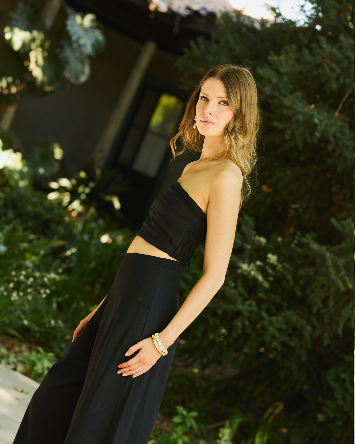 Su diseño strapless con pliegos realza el busto con delicadeza.